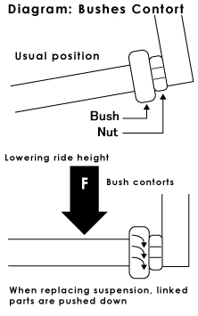 When lowering the ride height using shock absorbers or springs, bushes of the suspension arms' moveable parts may twist (Diagram). This restricts the ride height drop and can cause unusual sounds. To avoid this, after installing the dampers or springs, make sure to loosen the suspension arms' joint bolts with the vehicle resting on the ground, and shake the vehicle body a few times before retightening. This should relax the strained bushes in the suspension arm joints.