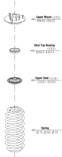 An upside-down strut top bearing can cause noise and obstruct steering, and in the long run result in damage to itself and the upper spring seat. During installation, please pay special attention to which way the strut top bearing originally faces, and replace it the same way on top of the TEIN upper spring seat (Diagram). The vehicle's original upper mount goes on top, and the securing top nut must be tightened at the prescribed torque.