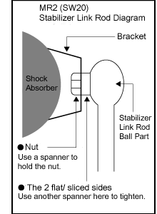 When attaching the stabilizer link to a shock absorber, be extra careful tightening it. Put the nut into the bracket on the shock absorber, and screw it onto the stabilizer link bolt's thread. To tighten, hold the nut in place with a spanner, and turn the bolt with another spanner on its flat base (12 mm wide). This is hard. Take care not to slip off the bolt's flat sides.