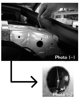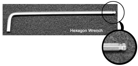 However, if you have a long hexagon wrench, it is possible to make adjustments via the holes in that bar. Since the rod top is not located directly underneath the hole, we recommend using a wrench with a rounded top that allows for manipulation from an angle (Photos 1-1 and 1-2).
