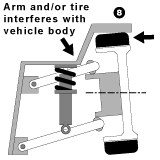 At all times stay within the shell case adjustment range specified in the instruction manual. Shortening the shell case too much is dangerous: before full compression, the tire will rub on the fender, and/or the upper arm will interfere with the vehicle body (Figure 8). Not only can shocks not be absorbed anymore, but the vehicle will suffer from blocked steering, loosing tire grip, etc., which put it in an extremely dangerous condition.