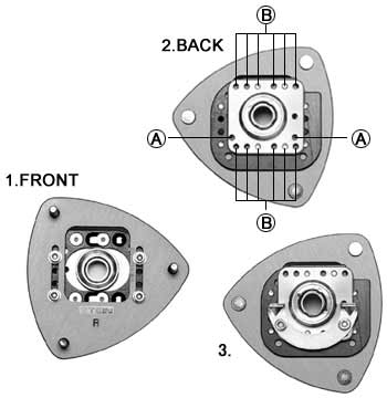 When using the EDFC Series with strut type SUPER RACING, the many holes for camber and caster adjustment in the pillow ball upper mount make it hard to see which are for anchoring. The right holes to anchor the Strut Kit are the ones marked A in Photo 2. Any other ones are unfit. Holes B are the same size and also offer screw threading, but they serve for caster adjustment. They cannot be used to anchor the Strut Kit. Please check the right holes when installing. (Photo 3)
