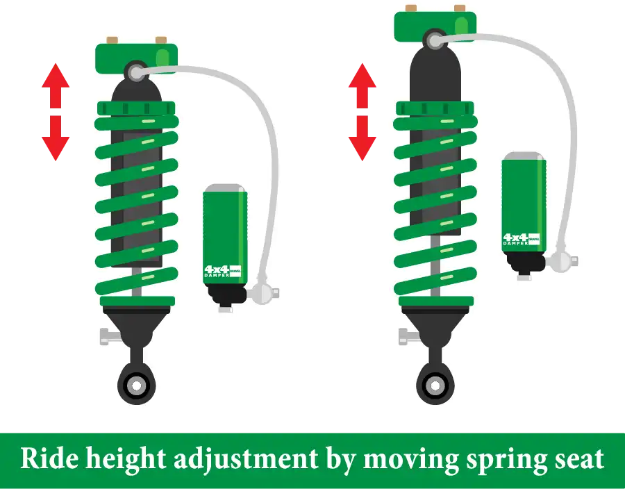 The ride height can be adjusted by moving the spring seat up or down. Characteristic of this system are its simple structure and ease of use.