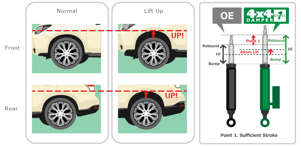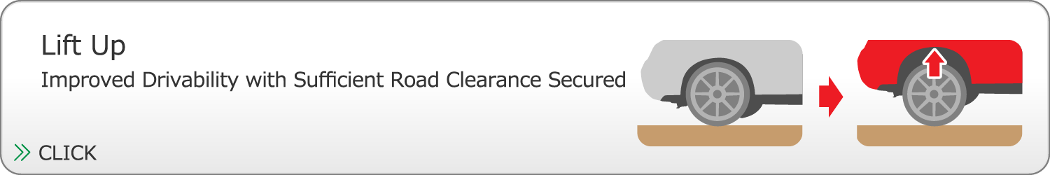 Standard ride height for 4x4 DAMPER GRAVEL 1 is set at 40mm (approx. 1.5in) higher than the original, to secure sufficient road clearance to accommodate various driving scenes from streets to off-roading.