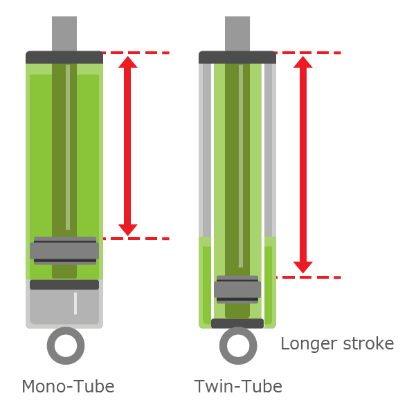 Compared to the regular mono-tube system, twin-tube attains longer strokes with a smaller repulsive force, resulting in high ride comfort.