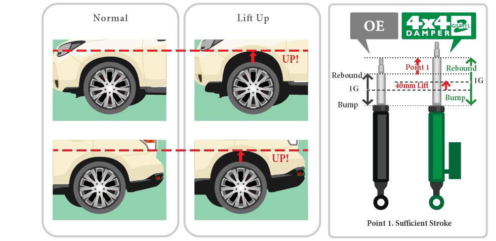 Standard ride height for 4x4 DAMPER GRAVEL 2 is set at 40mm (approx. 1.5in) higher than the original, to secure sufficient road clearance to accommodate various driving scenes from streets to off-roading.