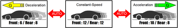 | This mode allows using Speed-Sensitive and Longitudinal G-Actuated Automatic Adjustment Modes simultaneously. By automatically and comprehensively adjusting damping force in response to changes in both vehicle speed and longitudinal G-force, most desirable control is achieved at wide varieties of conditions and for various purposes for optimum performance. |
