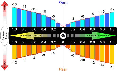 | Damping force is adjusted linearly according to the preset G-force values, automatically supplementing the values in between, for smoother & more gradual change. |