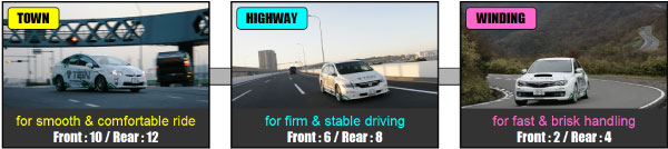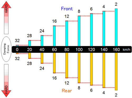 For example, on streets, damping force is set to softer level while driving slower for softer ride without any bumpy feel and set to harder level when driving faster for better stability and handling.