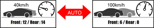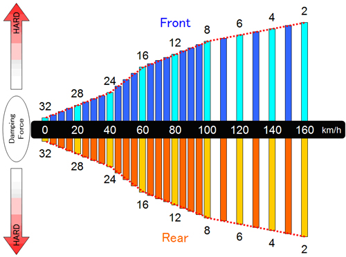 On circuits, damping force can be controlled according to speed range to change handling performance, such as reducing understeer a bit at low speed corners and reducing oversteer a little at high speed corners. |