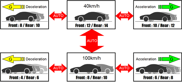 On circuits, understeering/oversteering can be controlled by setting damping force to increase stability while braking and setting up front/rear damping force separately to correspond to degree of acceleration/deceleration. |