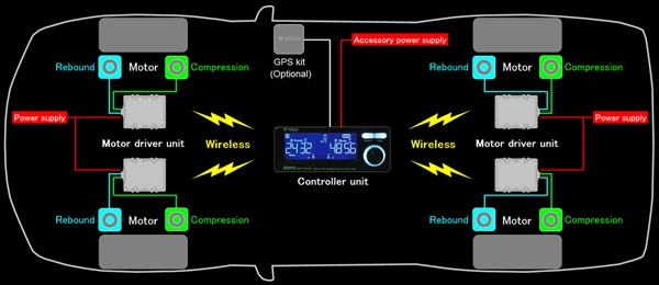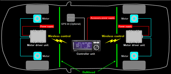 - Motor driver units, located at front and back of the car, and controller unit are connected wirelessly, to reduce troublesome wiring works. Controller unit has all the sensing functions, with built-in optical sensor to detect brightness in its surroundings and connectivity with optional GPS kit to detect vehicle speed. The power supply cable is the only wiring required between the controller and the vehicle, making it possible and easier to install onto wider varieties of vehicle models. Well-considered size and design enable controller unit to be installed to most desirable position easily without any bulky wiring.