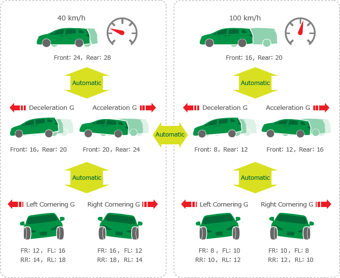 You can pre-set the damping force to the amounts of the lateral G-forces, and also customize the balance between front and rear damping.