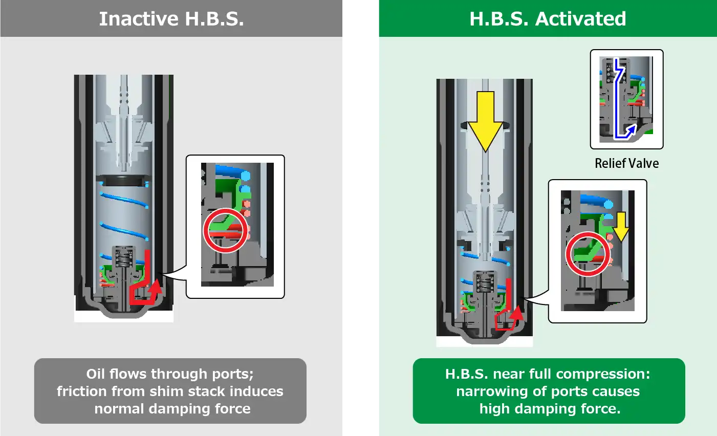 Near full compression, when the piston rod strokes beyond a predetermined point, the operative valve is pushed down and activates H.B.S.: the base valve ports are narrowed, blocking the oil flow. This results in high damping force.