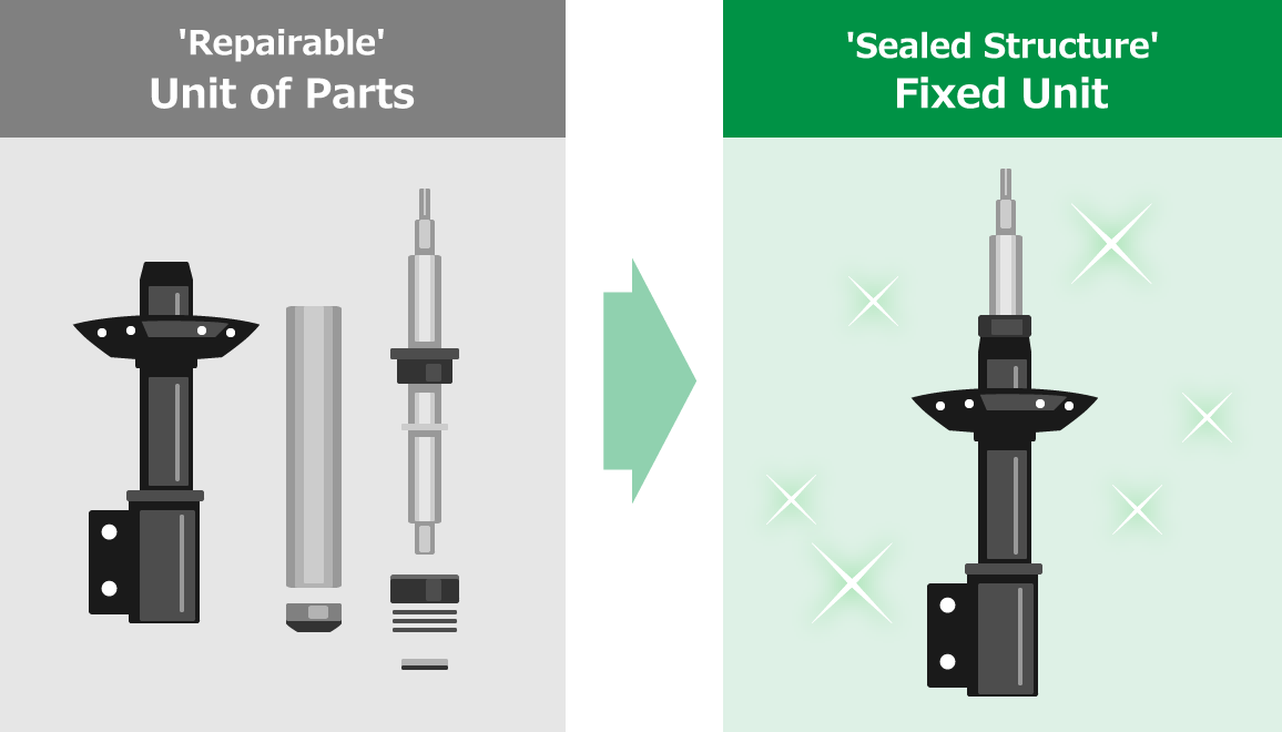 The shell case, the key part of the shock absorber, is made of a high-strength material with tensile strength around 150% of the OE shell case. Weight increase is curbed by keeping the thickness of the cylinder wall the same. A bigger shell case diameter expands its oil capacity, for improved durability as well as a long-term stable damping force performance.