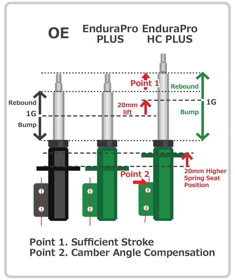 OE-shaped damper, EnduraPro HC PLUS, allows for 20mm ride height raise, with other features and specifications of EnduraPro PLUS maintained.