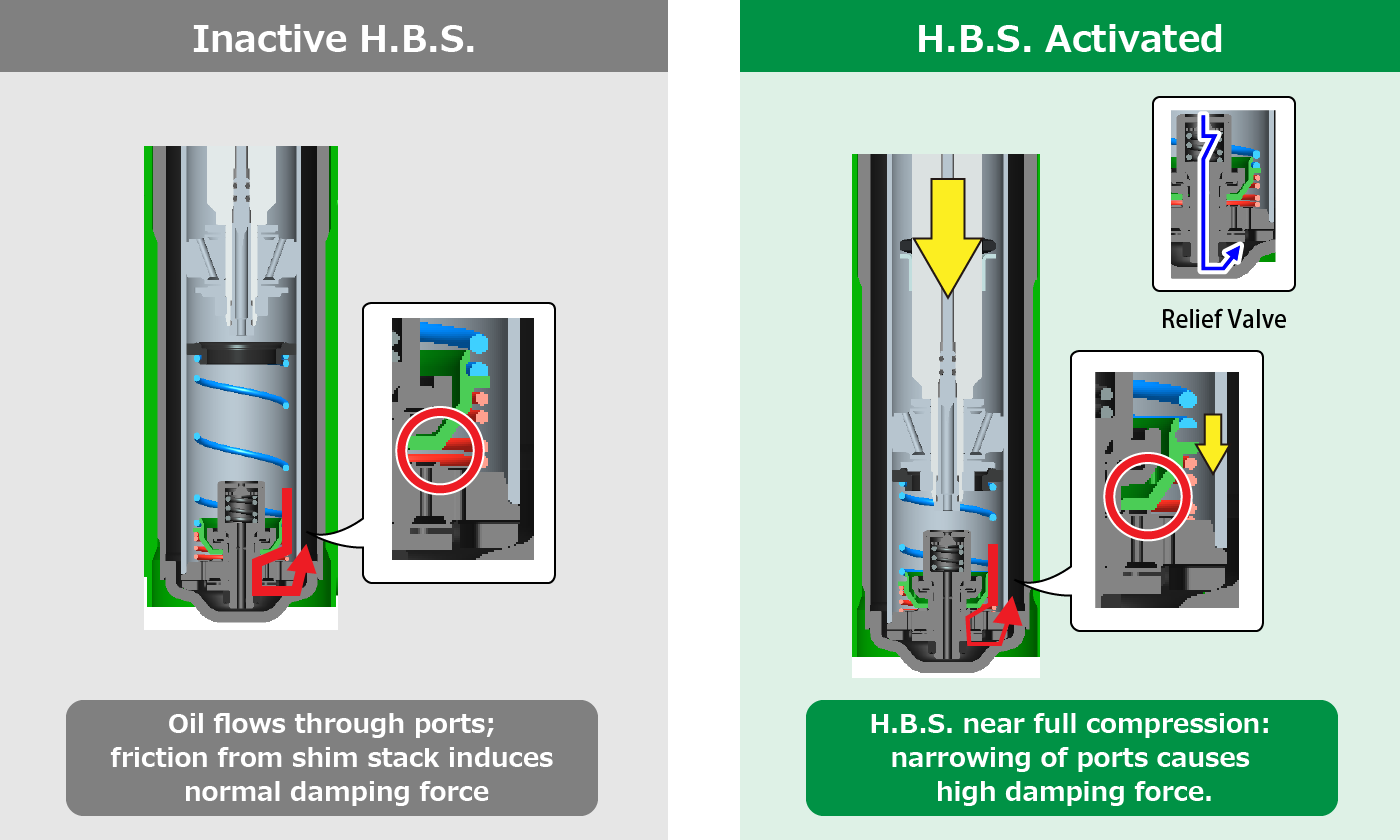 Near full compression, when the piston rod strokes beyond a predetermined point, the operative valve is pushed down and activates H.B.S.: the base valve ports are narrowed, blocking the oil flow. This results in high damping force.