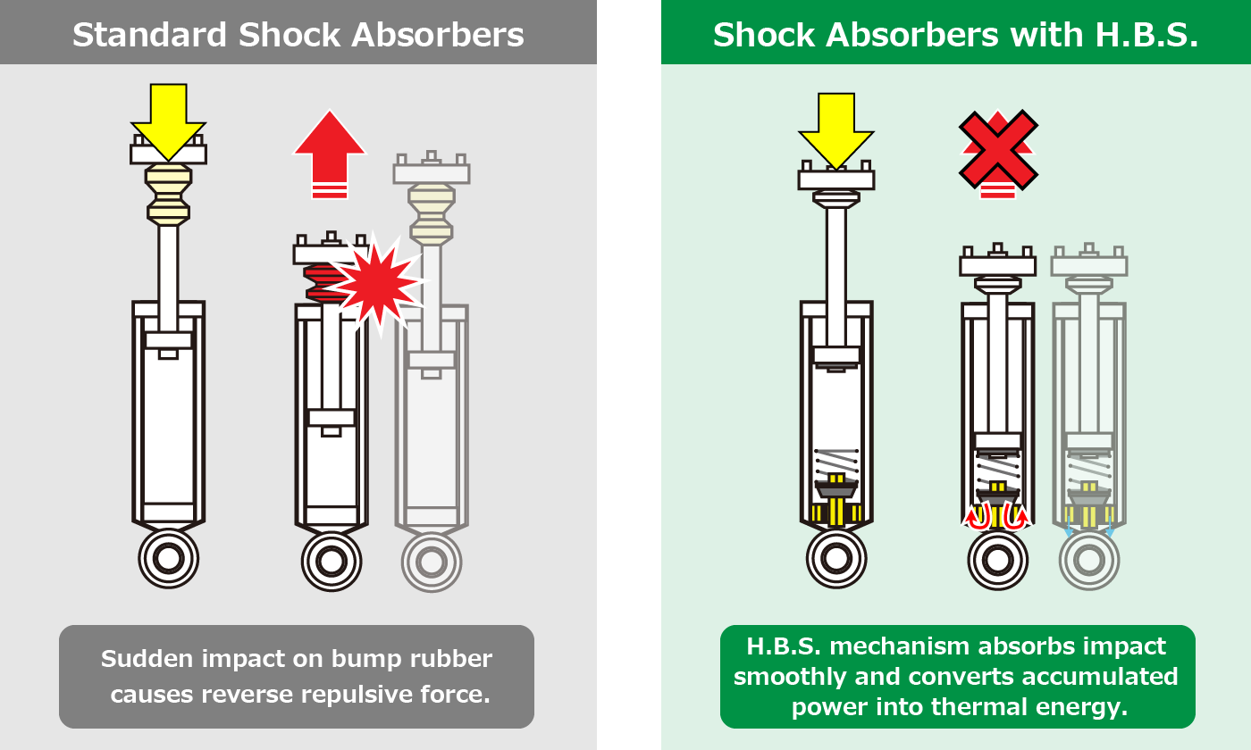 To avoid damages/breakages, conventional bump rubbers must also be fitted/used with H.B.S.-equipped dampers.