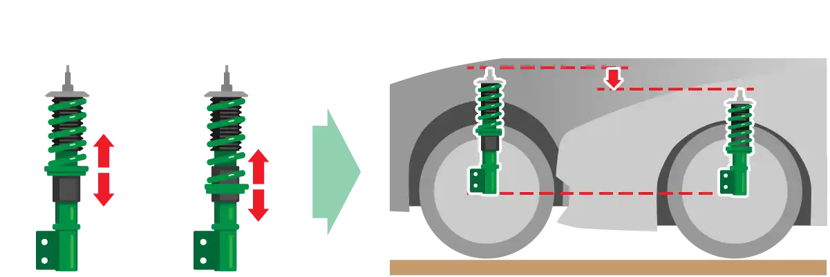 The ride height can be adjusted by moving the lower spring seat up or down.