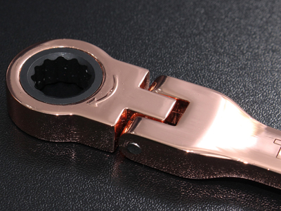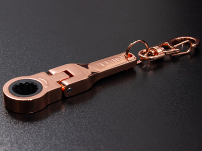 Small yet heavy-bodied miniature tool keychain in rare rose gold with mirror finish. Ratchet tool actually works on hex bolts & nuts with 10mm width across flats.