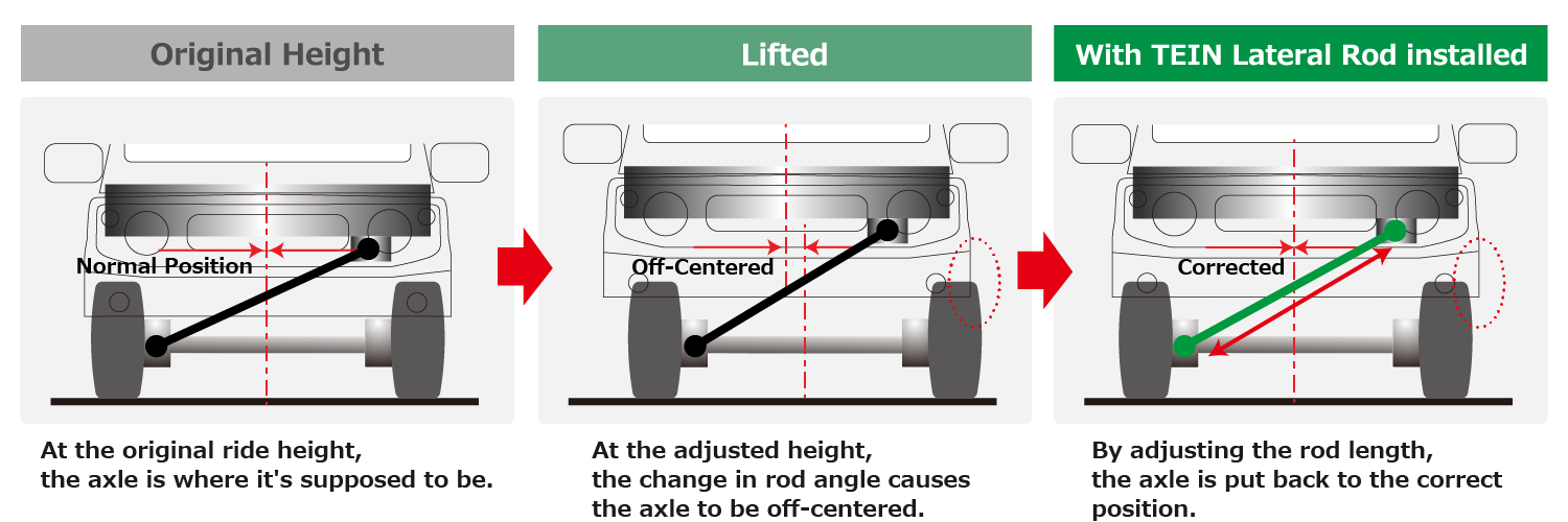 Vehicles with beam-axle suspension system are equipped with the lateral (Panhard) rod to connect the axle to the car body/chassis, preventing lateral movement. Under such suspension system, the axle is shifted sideways when the vehicle's ride height is altered(lifted). Lateral displacement of the axle can affect the vehicle's straight-moving behavior and cause the wheel on one side to protrude past the fender. In such case, the shifted axle position needs to be corrected by changing/adjusting the lateral rod length.