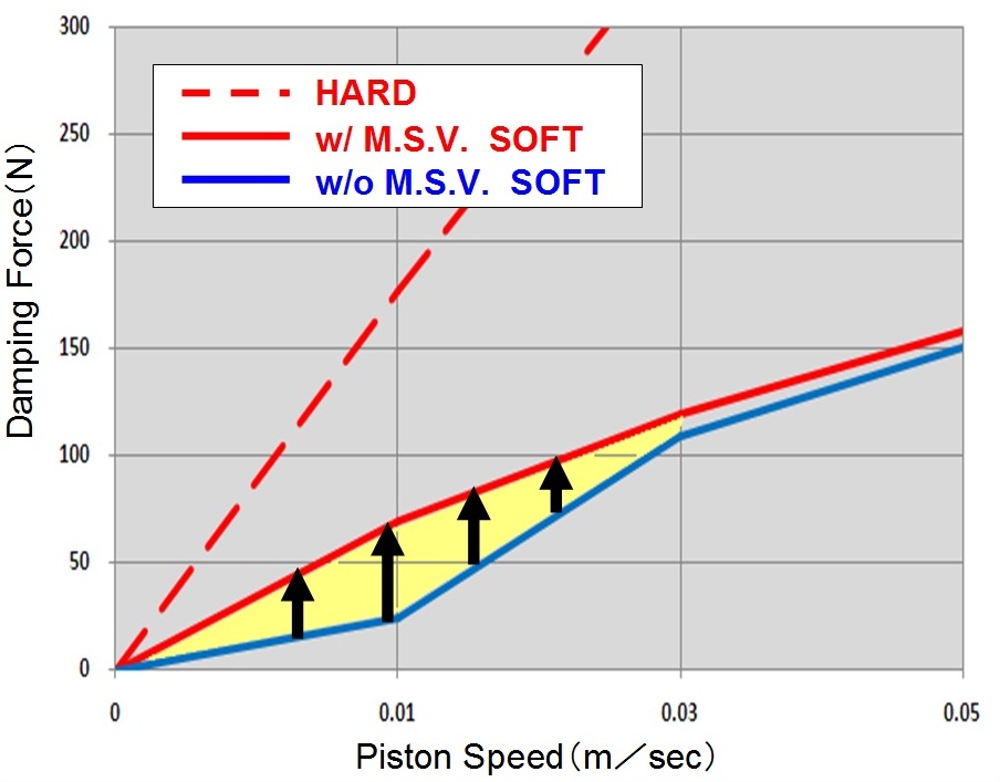 With the use of "ADVANCE M.S.V.", damping force adjustable range is made about three times wider, yet superior damping force characteristics are maintained in all parts to improve steering response, road ability and traction performance.