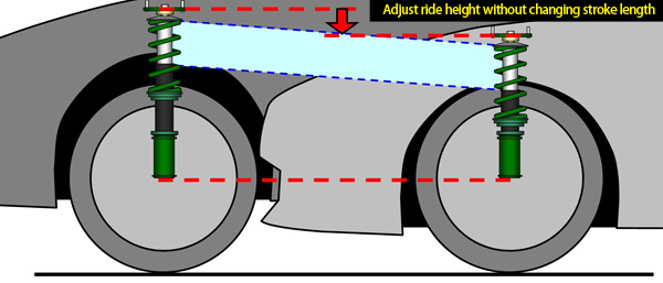 Full-length ride height adjustment system, used for MONO SPORT, enables adjustment of ride height by adjusting the case length, without changing the damper stroke length and/or spring pre-load. This has the advantage that the change in ride quality is kept minimal when the height is adjusted.