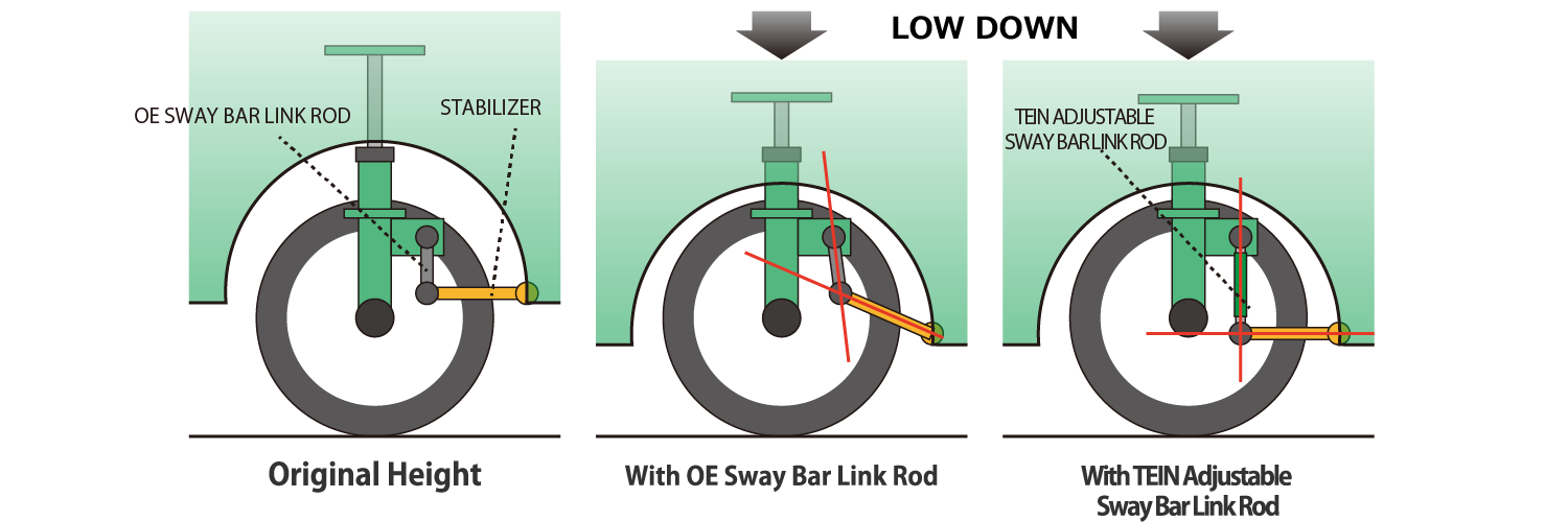 Adjustable link rods allow you to adjust the stabilizer angle which is altered when the carʼs ride height is lowered or lifted. Fine & precise adjustment in millimeters for optimum angle. Easy installation - simple replacement of OE parts.