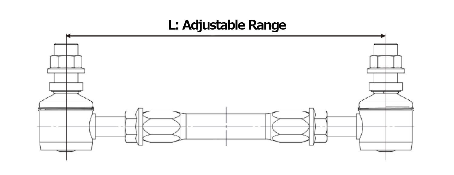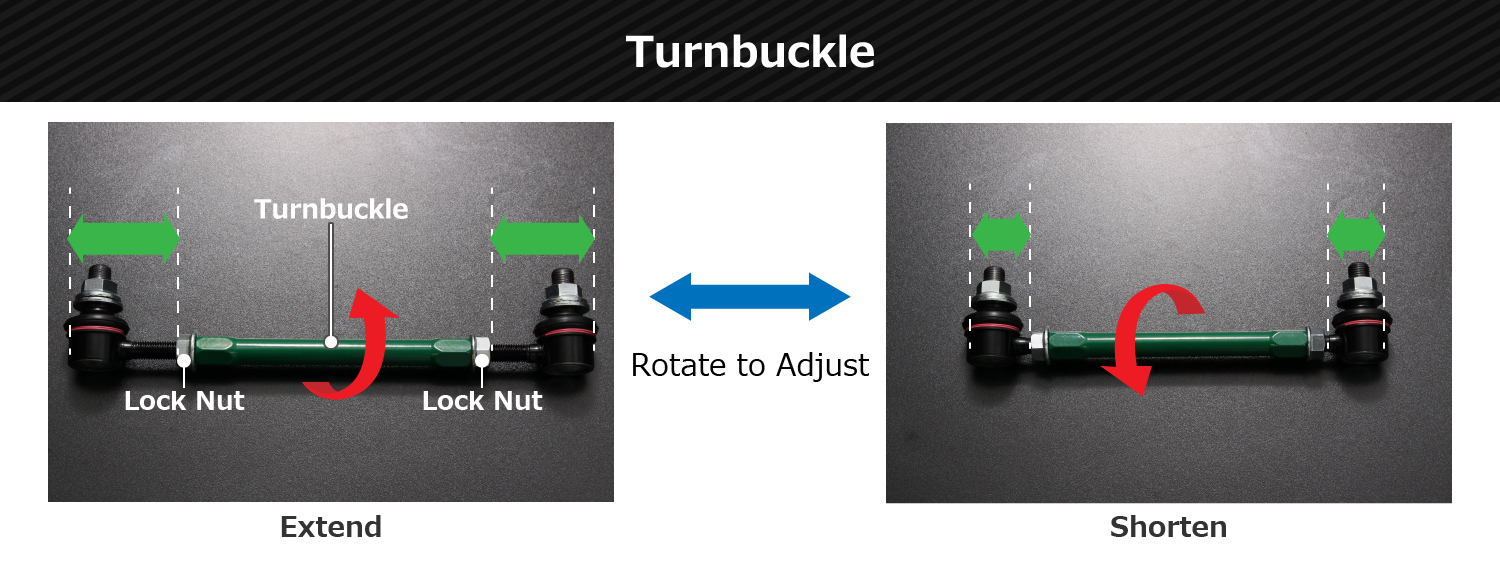 Turnbuckle adjuster enables the length tuning without removing the Adjustable Sway Bar Link Rod from the vehicle. The length can be changed by a millimeter increments, simply by loosening the nut and turning the rod, with the Adjustable Sway Bar Link Rod itself still on the vehicle.