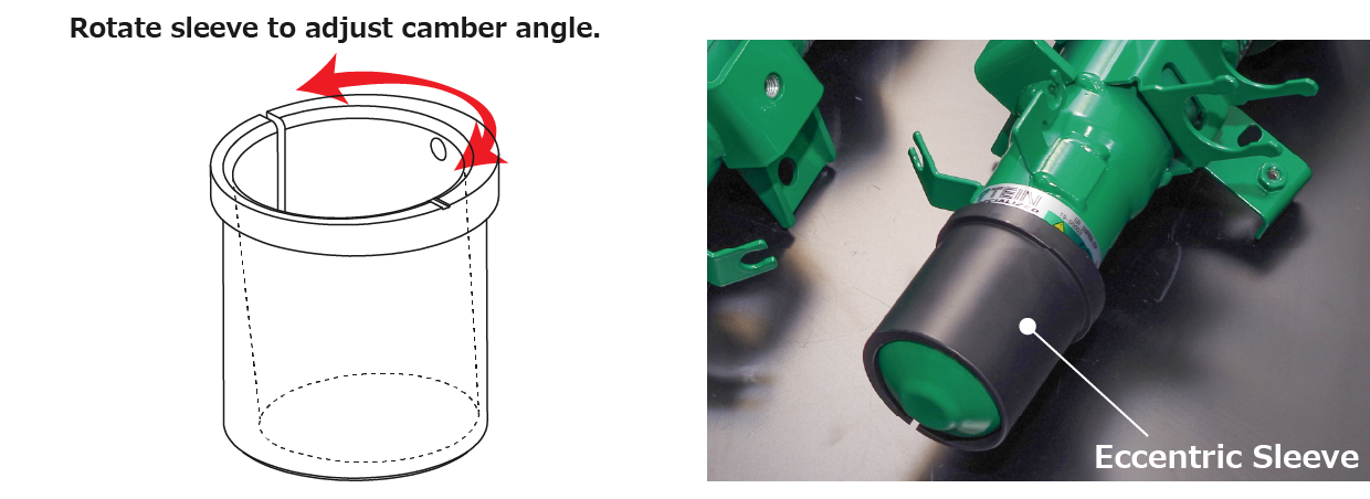 For some vehicle models with insert-type struts, eccentric sleeves are used to enable camber angle adjustments. By rotating the sleeves, camber angle can be adjusted to either negative or positive, from the standard position.