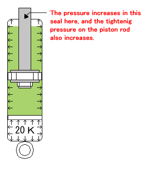 When the gas chamber is filled with high-pressure gas, there will be an equal amount of pressure exerted inside the shock absorber, as the effects of Pascal's Law. In such state, there will be a high pressure applied to the oil seal, which will lead to increase in restraining force on the seal and friction.
