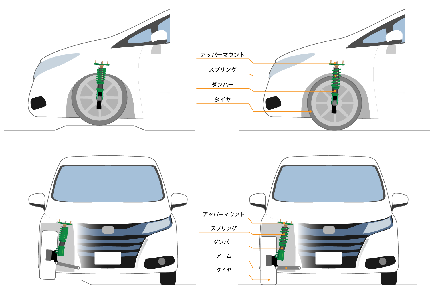 サスペンションとは、アッパーマウント/スプリング/ダンパー/アームなど