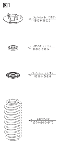 正しい組付け方法は、ダンパーキット付属のアッパースプリングシートの上に、純正時と同様の向きでストラットトップベアリングを載せ、純正のアッパ-マウントを重ねてから、トップナットを規定トルクにて締めつけてください。【図1参照】