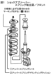 これは、アッパースプリングシートの形状がほぼ真円でありながら、そのセンターホールが若干オフセットしているためです。したがって、ショックアブソーバ一式を分解する前に必ずマ-キングをし、組立時に同位置になるように注意して下さい。【図1参照】