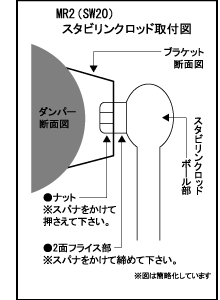 本車種の、フロントスタビリンクをダンパー本体についているブラケットに固定する際は、その締め付けに充分気をつけてください。ブラケットの内側にナットを入れ、スタビリンクのボルト部のネジを噛ませていきます。その際、最後にトルクをかける時点でナットにスパナをかけて押さえ、リンクのボルト部の根源にある2面幅(12mm)部へかけたスパナで締めてください。非常にやり難い為、くれぐれも2面幅の部分をなめない様に、注意してください。