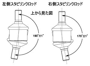 スタビリンクロッドは、車種により左右で互換性が無い物があります。図はフィット(GD1)用のスタビリンクロッドを真上から見たものですが、左右で取付け角度が異なっているのがわかります。他にもモビリオ(GB1)、アクセラ(BK3P)、デミオ(DY5W)、セリカ(ZZT231)などのスタビリンクロッドも、左右の取付け角度が異なっています。