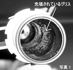 倒立式のショックアブソーバは、ストロークする際の動きをスムーズにするために、シェルケース内部に多量のグリスが充填されています。【写真1】この充填されたグリスから分離した油分が、シェルケース底部の空気穴【写真2】よりにじみ出し、オイル漏れと誤解される場合があります。またこのグリスの余分な部分が、夏の外気温やブレーキの放射熱によって粘度が低下し、同じく空気穴からにじみ出すケースもあります。