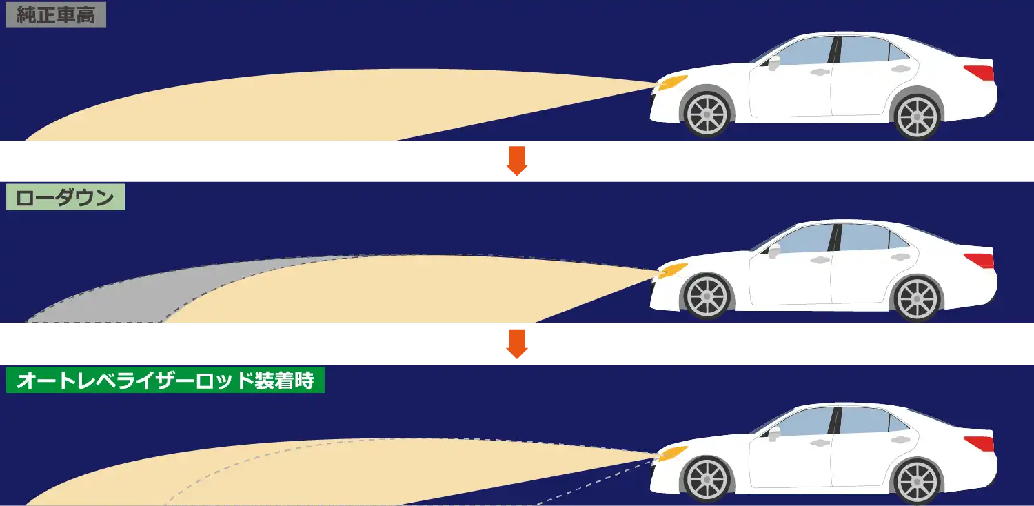 オートレベリング機構が搭載された車種でローダウンした際、リアのみセンサーを装備している車種が多いためリアの車高が下がってライトが上 向きになっていると勘違いして光軸を下げる調整を自動で行ってしまいライトが手前しか照らさない状態になってしまいます。