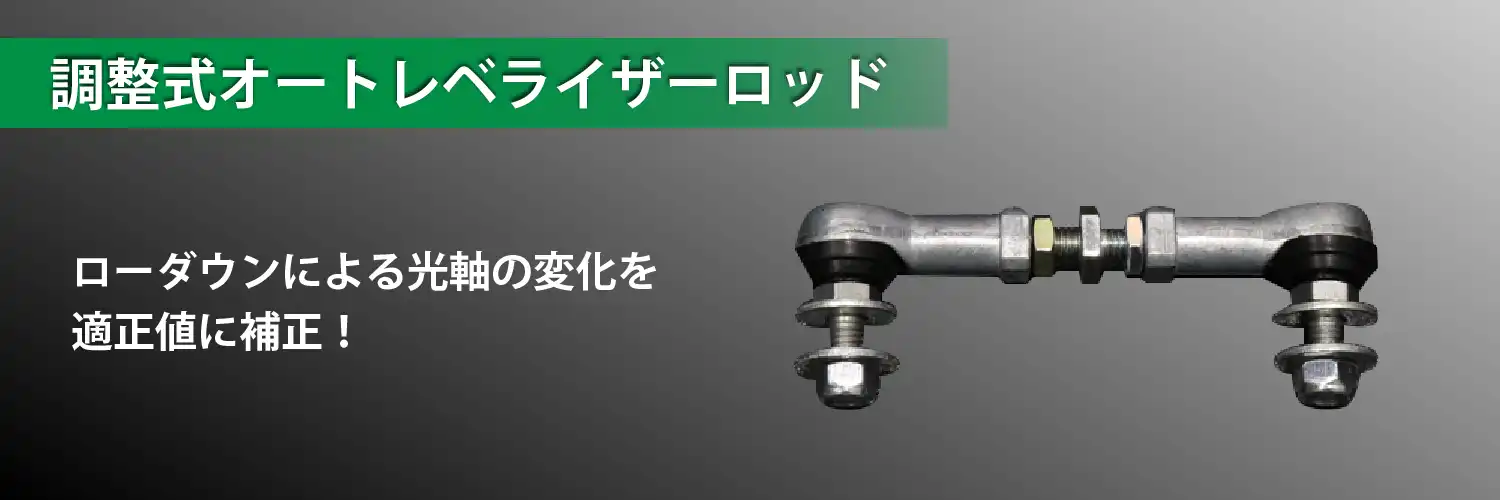 そこで調整式オートレベライザーロッドを装着することで、センサーの角度が純正車高時に近い角度へ修正され適正光軸での照射を可能にします。 本製品装着後は整備工場等でヘッドライトテスターによる光軸の確認、調整を行って下さい。