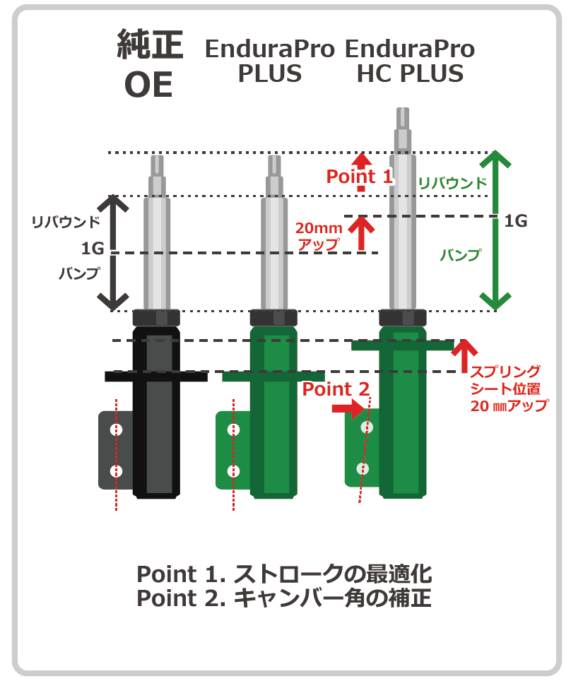 EnduraPro HC PLUSは、EnduraPro PLUSのスペックを継承しつつ、20㎜の車高アップを 実現した純正形状ダンパーです。