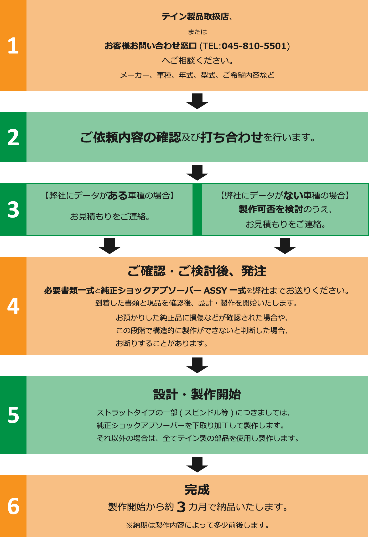 - ビンテージカー、スーパーカー、レーシングカー、キャンピングカー、軽トラック等、どんな車種でも製作致します。過去にテインでラインナップしていた車種はもちろんのこと、どのメーカーにもラインナップが無い車種でもOK。ストラットタイプの一部(スピンドル等)はフィッティングを考慮し、純正のショックアブソーバ、スプリングおよび アッパーマウントをASSY状態でお預かりのうえ、純正ショックアブソーバを下取り加工して製作致します。