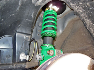 MONO SPORT -スタイリングについて- いわずもがなの全長式車高調。ストローク量を気にせず好きな車高に調整できます。 画像の車高は、リヤ側限界ダウンから7.5ミリ上げで、フロントもソレにあわせて調整してます。